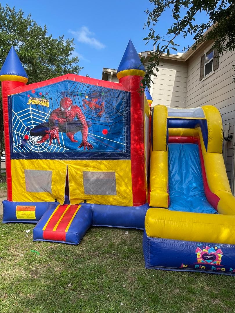 ALL THE SUPER HEROS WILL ENJOY OUR BRIGHT AND COLORFUL SPIDERMAN BOUNCE. LET THEIR IMAGINATION RUN WILD AS THEY PLAY, BOUNCE AND SLIDE. ALSO INCLUDES A BASKETBALL GOAL ON THE INSIDE FOR HOURS OF ENTERTAINMENT. OUR INFLATABLES ARE CLEANED AND SANITIZED AFTER EACH USE TO ENSURE THE KIDDOS HAVE A GREAT AND SAFE TIME ENJOYING THEMSELVES AT THE PARTY.