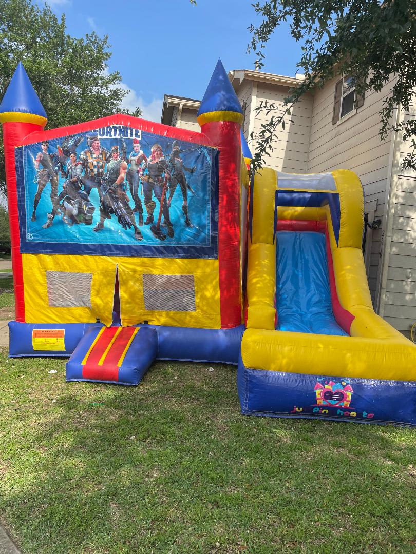 ALL THE SUPER FANS OF THIS GAME WILL ENJOY OUR BRIGHT AND COLORFUL FORTNITE BOUNCE. LET THEIR IMAGINATION RUN WILD AS THEY PLAY, BOUNCE AND SLIDE. ALSO INCLUDES A BASKETBALL GOAL ON THE INSIDE FOR HOURS OF ENTERTAINMENT. OUR INFLATABLES ARE CLEANED AND SANITIZED AFTER EACH USE TO ENSURE THE KIDDOS HAVE A GREAT AND SAFE TIME ENJOYING THEMSELVES AT THE PARTY. THIS INFLATABLE IS USED DRY ONLY!
