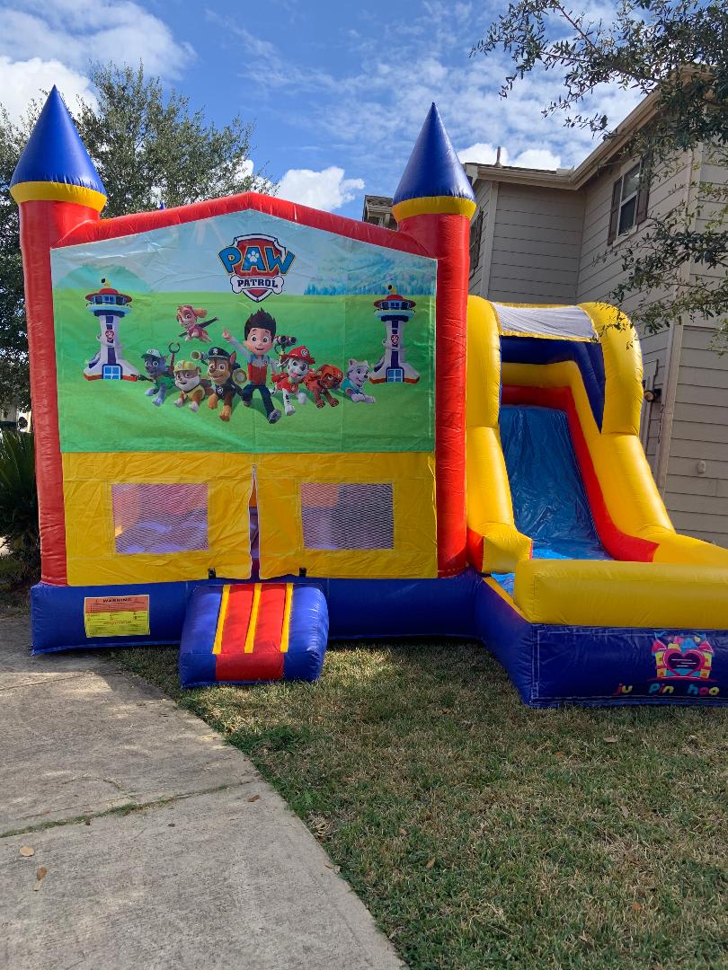 Perfect for girls and boys alike. This paw patrol bounce house will definitely brighten the party. Rent our multi-colored, fun bouncy today- perfect for any event including birthday parties, graduations, festivals, church gatherings, and just because celebrations. There's lots to to do with this inflatable including jumping and bouncing, playing basketball with the goal that's on the inside, and taking rides down the fast slippery bouncy slide. Perfect for all ages. Also check out our other themed bouncy slide combos.
