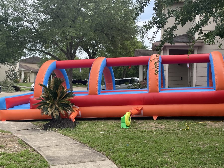 Looking for something a little less busy? Try our huge 30ft long multi-colored Slip N Slide today. A great way to cool off and burn some extra energy all at the same time. Perfect for birthday parties and outside fun for the family. This slip n slide is made for cool, slippery, fast paced enjoyment for kids of all ages. Customer must provide electric outlet, water hose can be provided if needed. Book today for best availability.